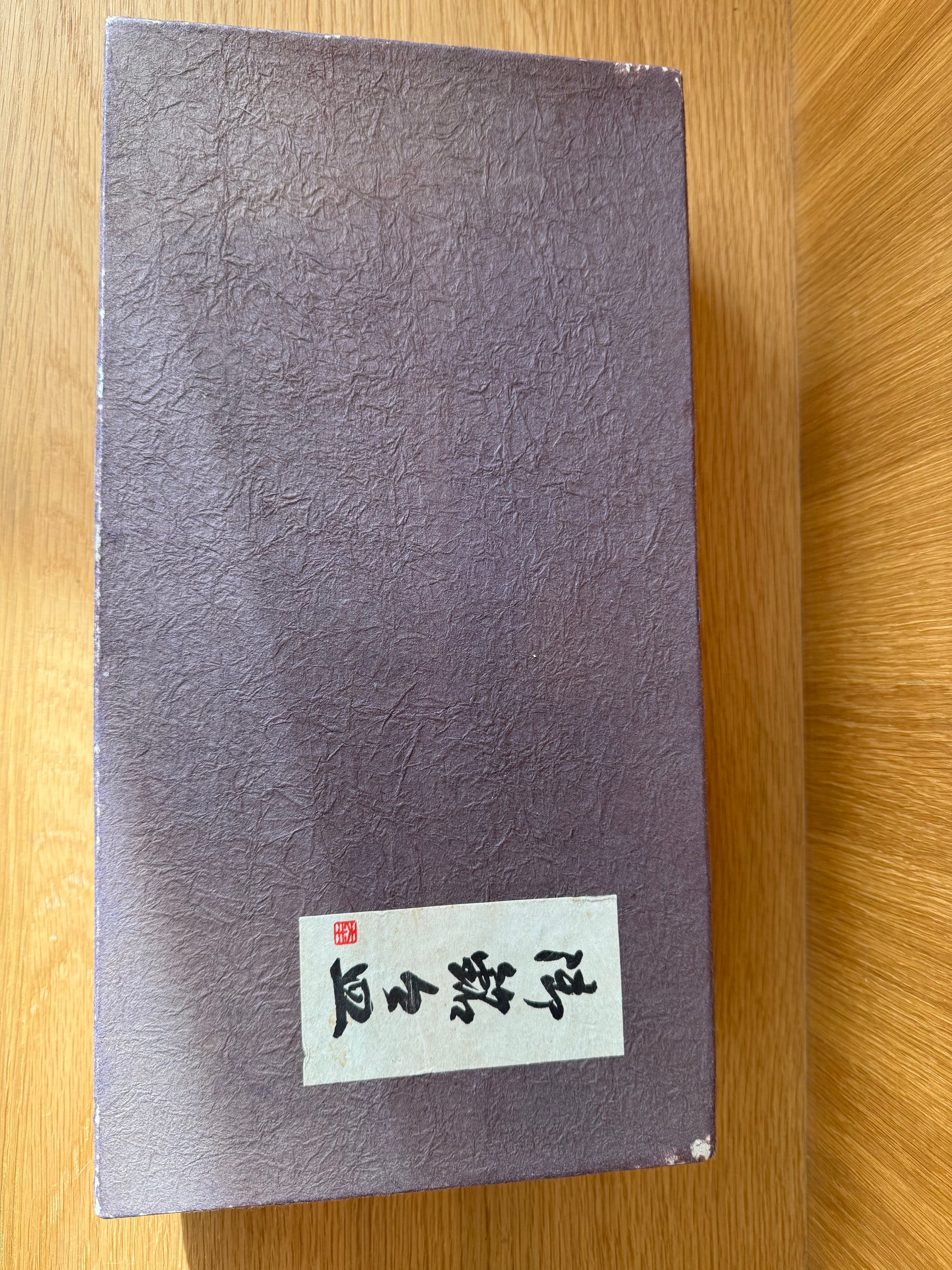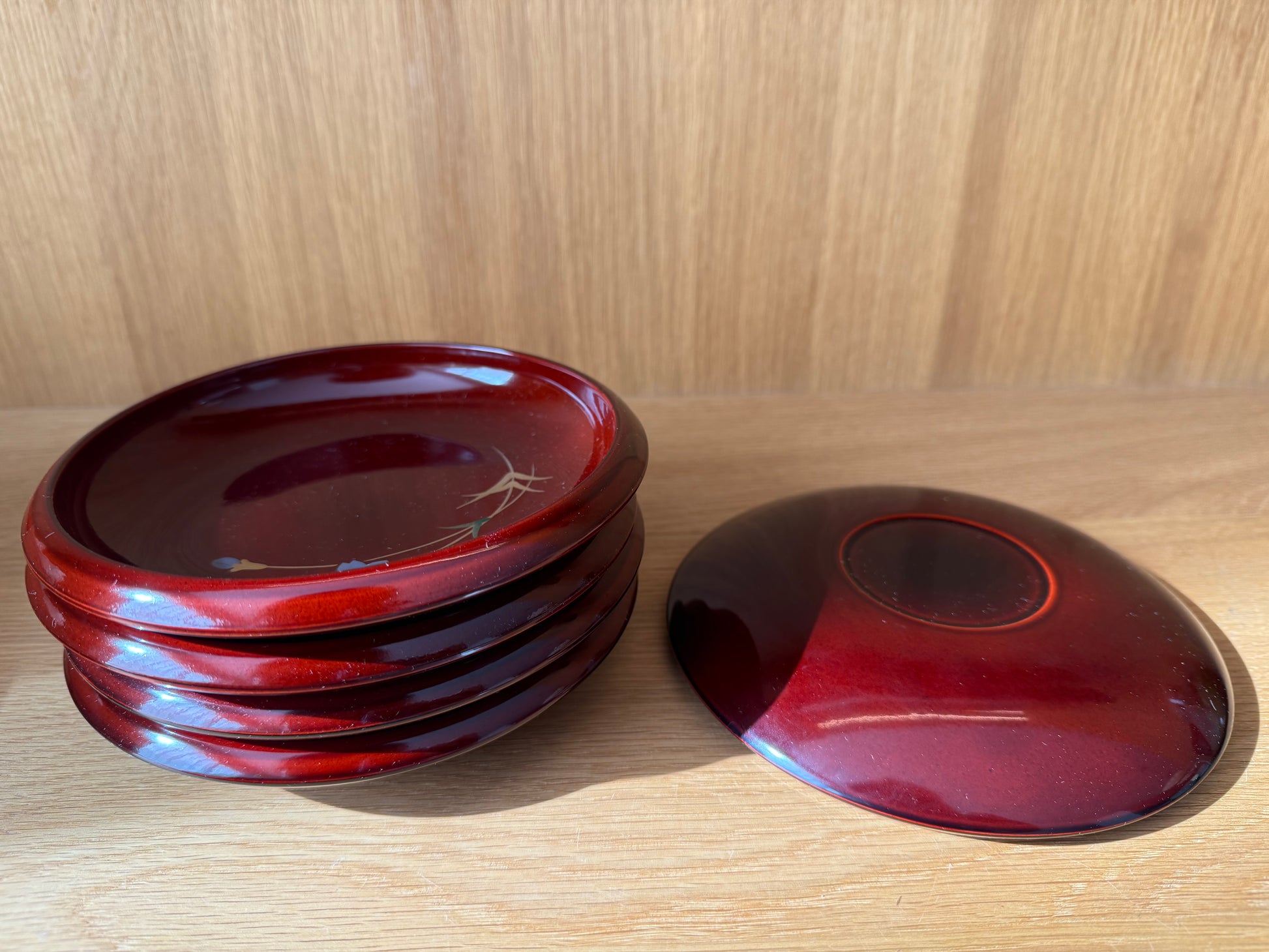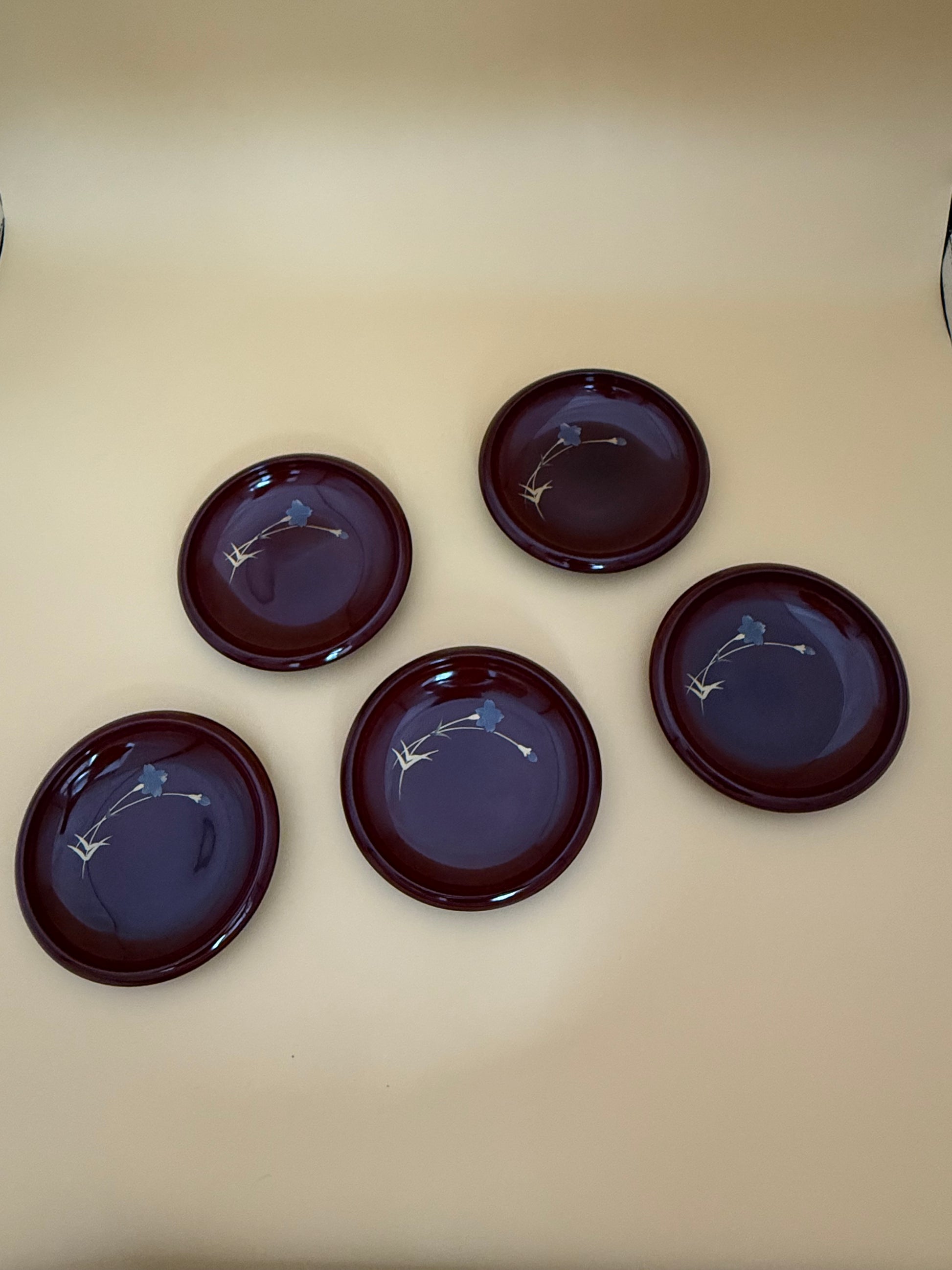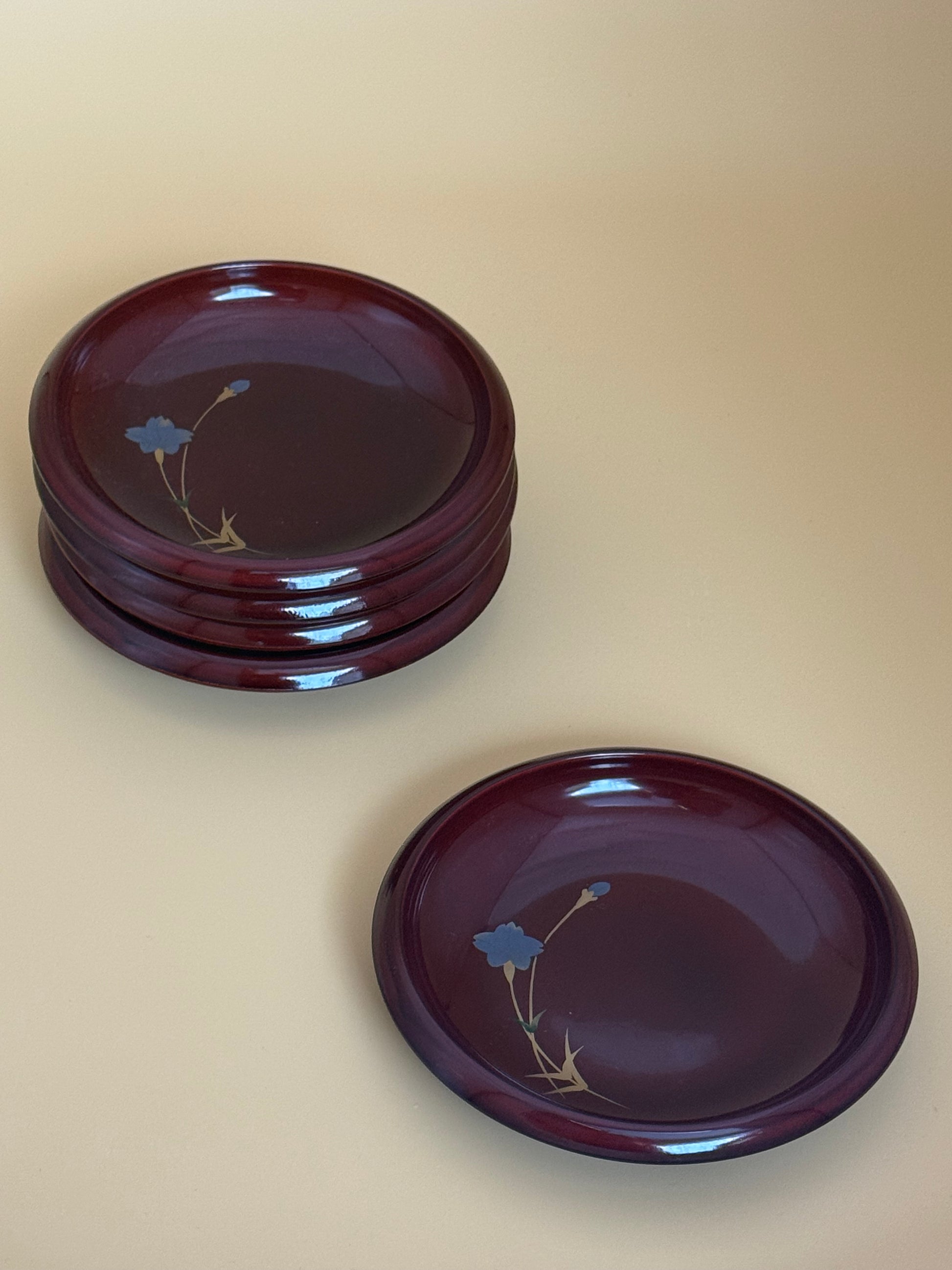 A graceful set of five hand-painted wooden plates, traditionally used for serving wagashi (Japanese confections). Each plate is carefully crafted with lacquer, providing a lustrous finish that highlights the natural beauty of the wood. Adorned with a delicate blue flower, hand-painted with subtle elegance, these plates bring a touch of timeless artistry to your table. Perfect for special occasions or as a thoughtful gift, they celebrate the harmony of function and beauty in Japanese craftsmanship. All plates are in excellent condition.